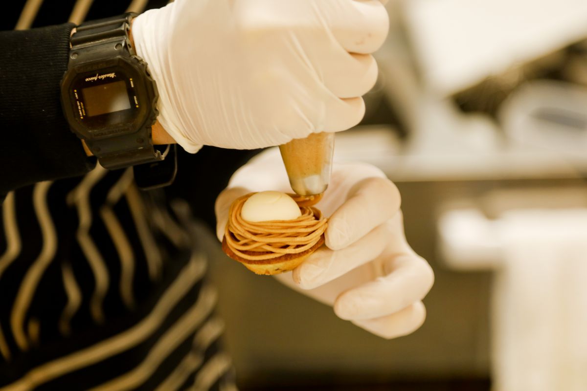 ショーケースの中には常時15種類以上のプチガトーが並び、見ているだけでハッピーな気分に。タルトやムース、モンブランなどバラエティ豊かなラインナップは、どれも小ぶりながら一つひとつにこだわりがギュッとつまっています。素敵なプチガトーに魅了され、足繁く通うお客さんも多いそう。