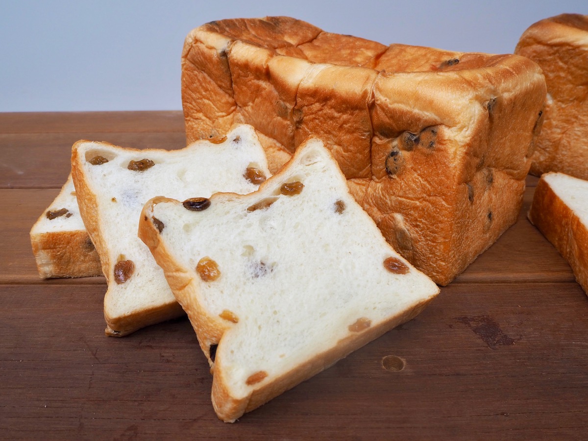 レーズンがたっぷり入っている「完熟モーニング」(2斤/1100円)。ミルキーな味わいの生地に、サンマスカットレーズンがふんだんに練りこまれています。甘みのある食パンと、みずみずしくフルーティーな酸味が絶妙にマッチ!バターをたっぷり塗っていただくのがおすすめです。