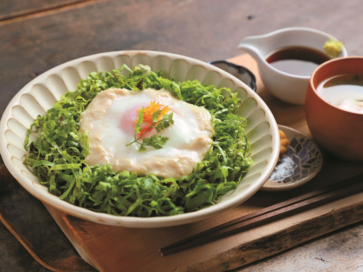 汲み上げ湯波、温泉玉子、グリーンリーフのハーモニーがクセになりそうな味わいで、とろみの付いたしょうゆベースのだしでいただく、ヘルシーでオリジナルティーあふれる逸品!