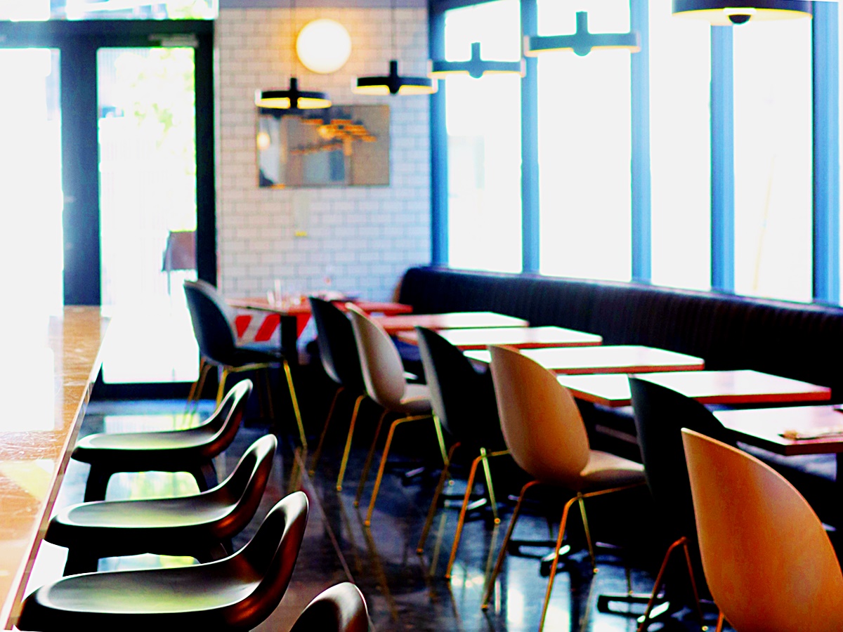 営業時間は朝の8時~24時。ブレックファストからランチタイム、ディナーからバータイムまで、さまざまな利用ができるオールラウンドレストランです。広々とした店内にはカウンター席とテーブル席があり、シンプルながらもモダンで落ち着いた雰囲気。