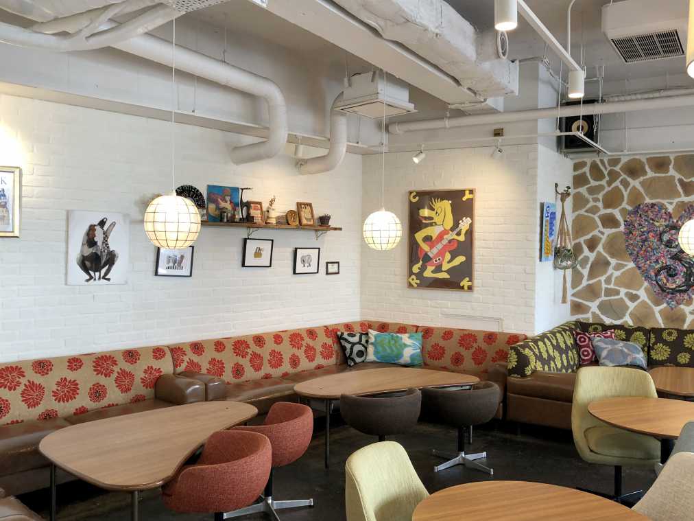 店内のインテリアは柄のソファや壁紙、至る所に飾られている絵など、カラフルで賑やかな印象。アメリカンなモチーフの小物が多く見られます。