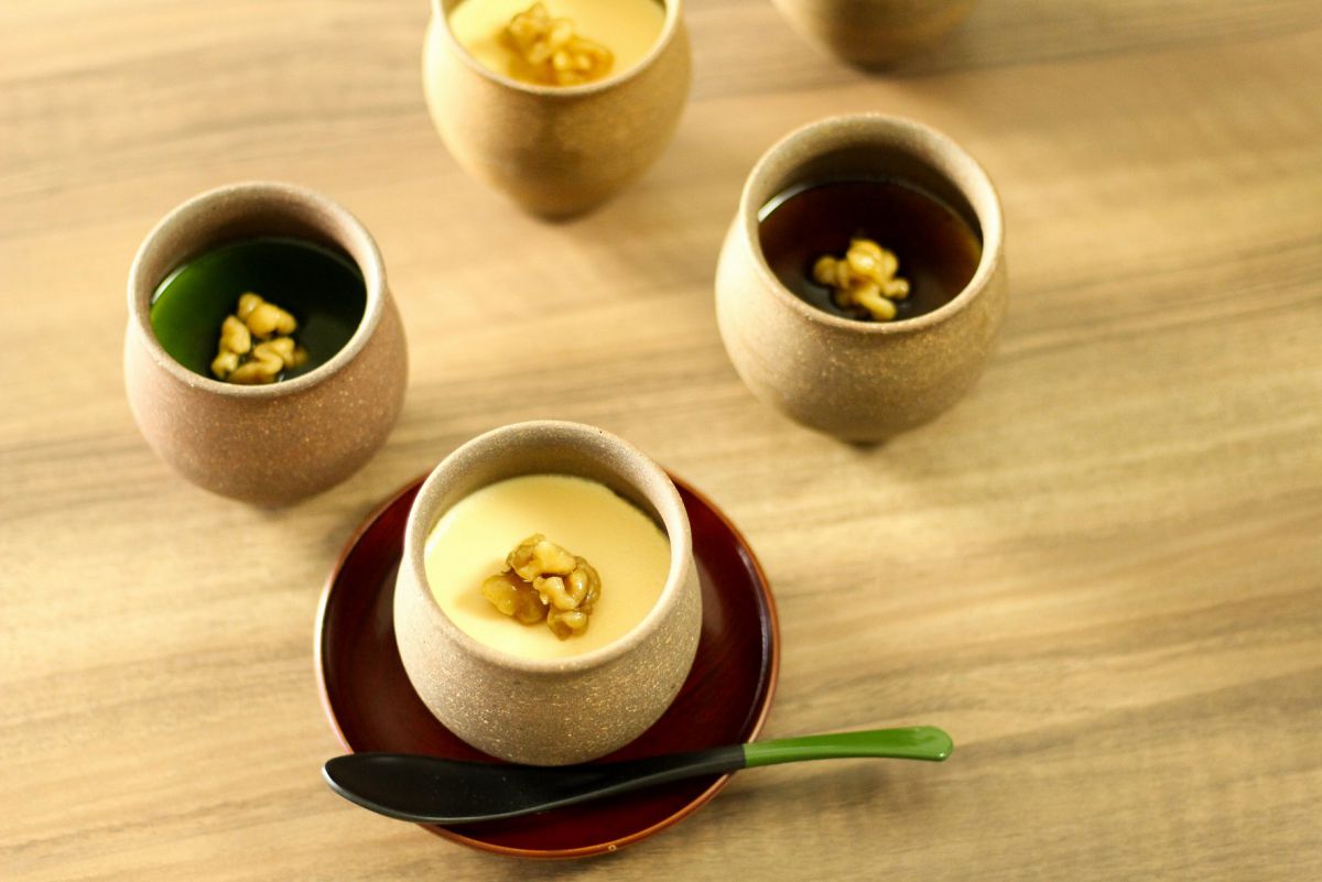 お茶づくしのスイーツも目が離せません。こちらは抹茶・紅茶・ほうじ茶の中からソースが選べる「自家製お茶プリン」各730円。