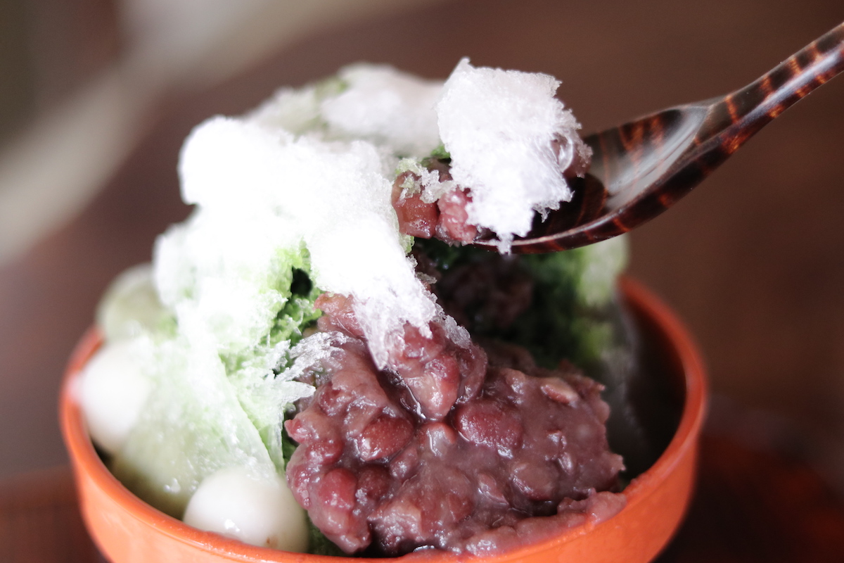 氷の下には、丹波大納言で仕立てたつぶあん、ほどよい食感の白玉、雑味のまったくない本わらび粉だけであつらえたわらび餅、つるりとした寒天が隠れています。表面の氷は味付けされていませんが、中の氷には抹茶の蜜がかかっていて、さじですくうと濃い緑が目に飛び込んできます。