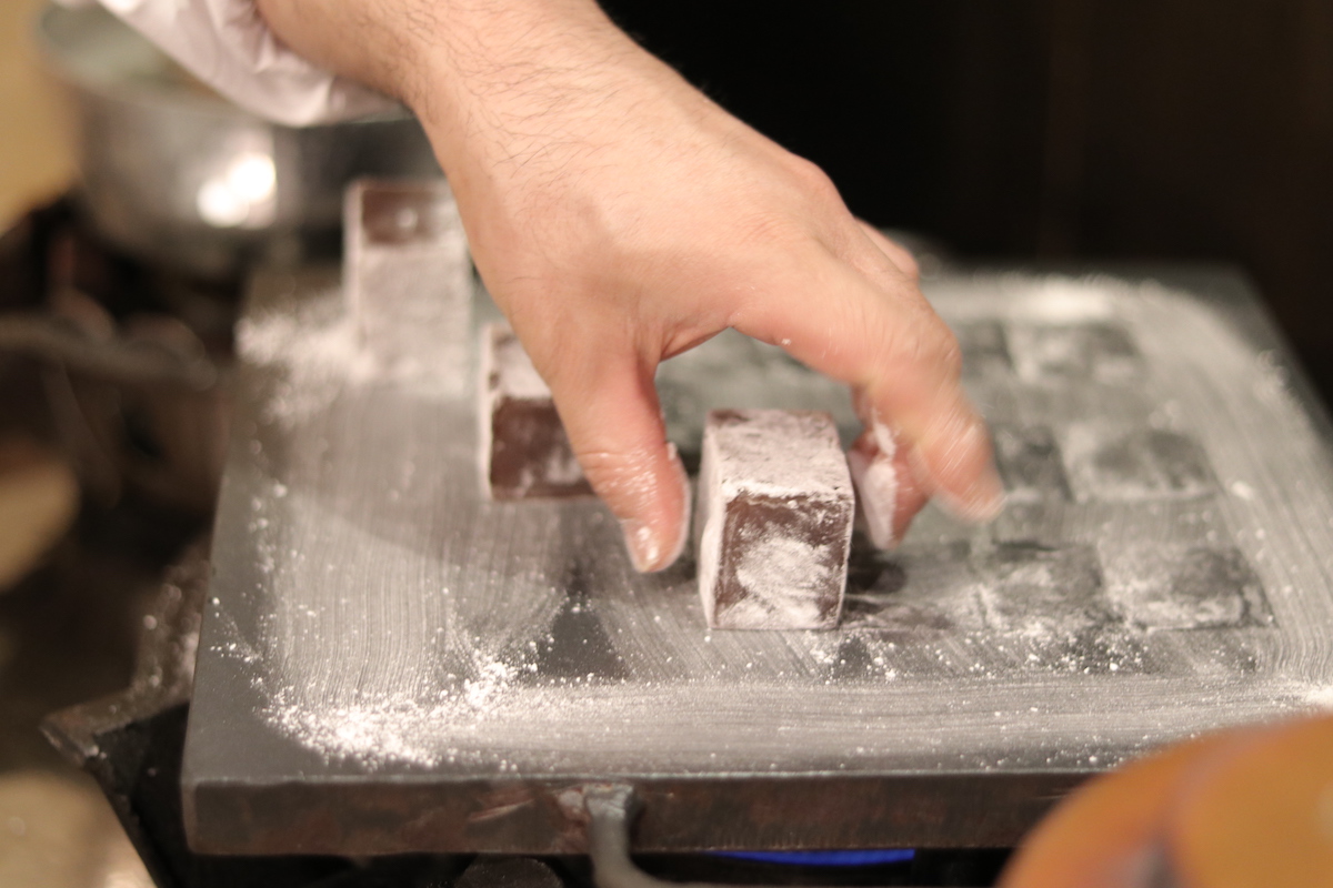 通年メニューのひとつ「みよしの」は、喜多さんイチ押しのお菓子。葛とあんこ、砂糖を合わせ、蒸して仕上げたお菓子に本葛の粉をまぶして、焼いていきます。