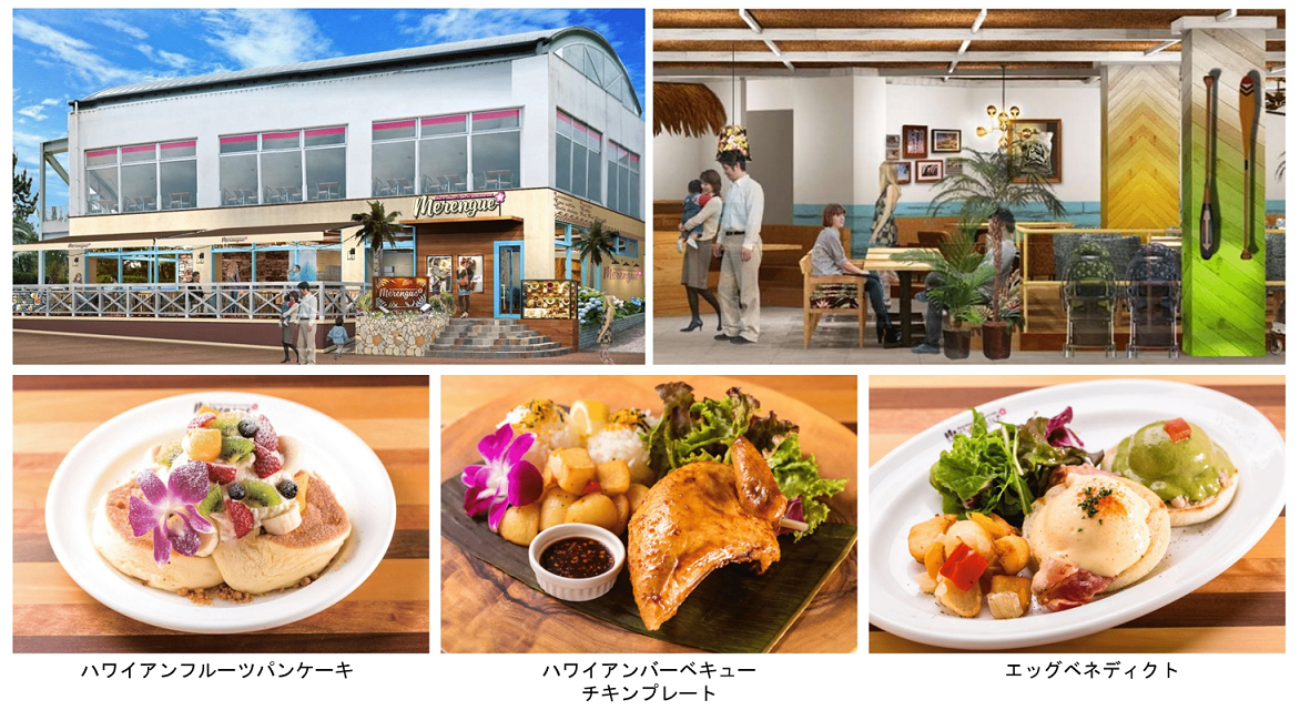 お腹がすいたら、ベイマーケットA棟1階に7月25日(木)オープンするハワイアンカフェ&レストラン「merengue(メレンゲ)」へ。ゆったりとしたハワイアンリゾートの雰囲気の中で、焼き立てのふわふわパンケーキや、チキンプレート、エッグベネディクト、ガーリックシュリンプなどのロコフードが味わえます。