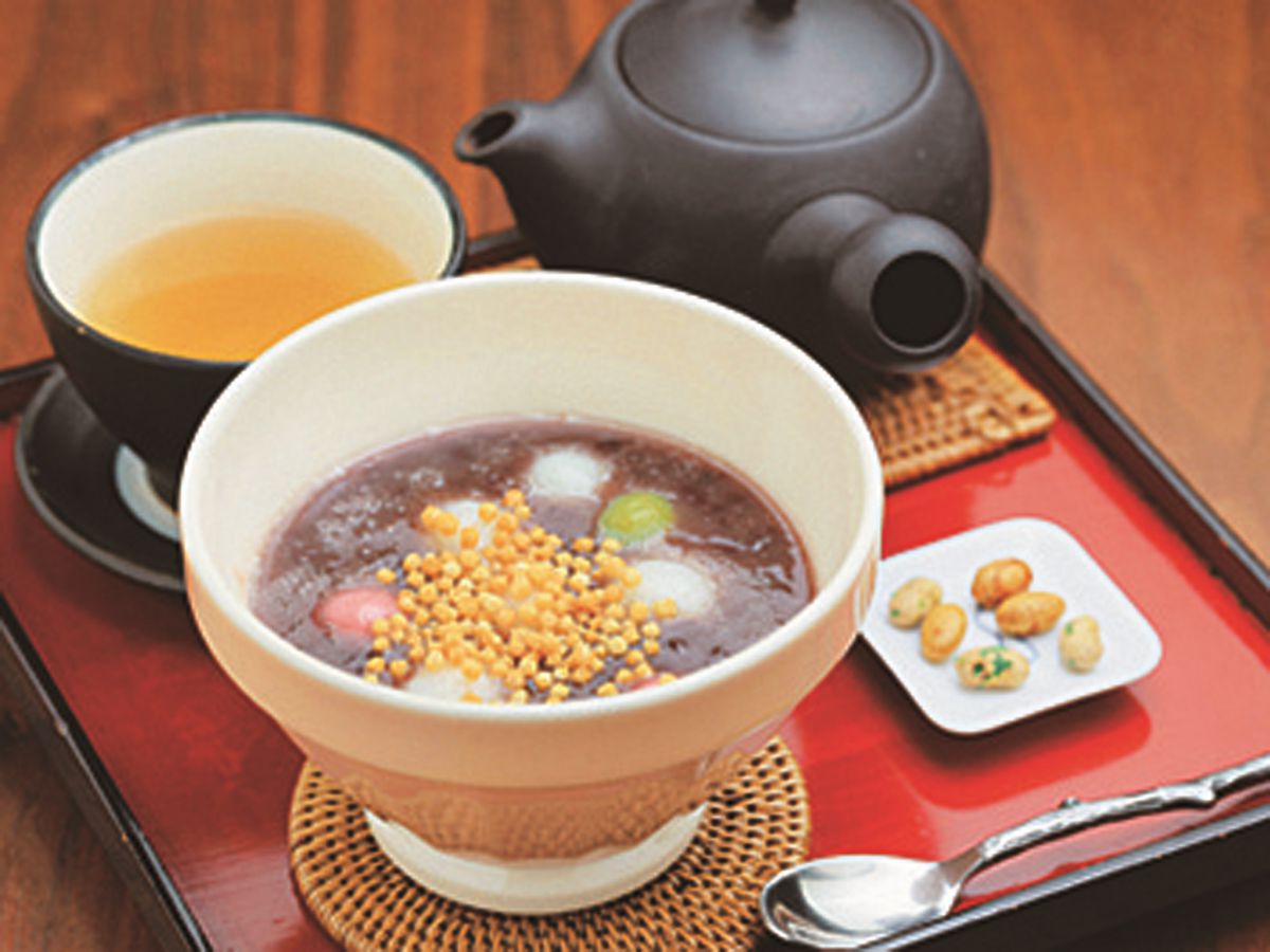 老舗蔵元「老田酒造店」の奥にあるカフェ。3色の白玉がかわいらしいぜんざい800円は、トッピングのあられがアクセント。温冷とも通年味わえます。抹茶パフェ800円といった通年楽しめる人気の定番メニューに加え、夏のわらび餅500円など季節を感じさせる期間限定メニューもあります。