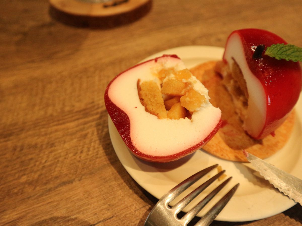 まずはリンゴのケーキから切ってみましょう。とっても柔らかいケーキなので、そーっとナイフを入れて、ゆっくり引いてくださいね。真っ赤な皮に見せた外側は、フランボワーズのグラサージュ。白い果肉に見せた中身は、りんごのムース。甘酸っぱさがふんわり広がります。 中央部分には、シナモンケーキとキャラメリゼしたリンゴがごろっと。敷かれたパイ生地はサクサク。それぞれ単体でも、組み合わせても、幾通りもの楽しみ方ができます。