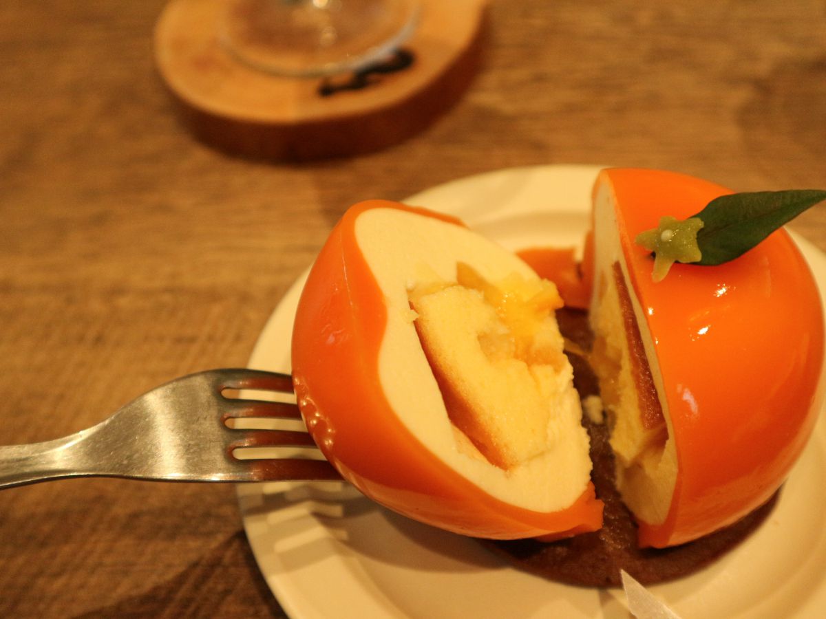 次は、新作のミカン!リンゴ以上のツヤ感がある外側は、マンゴーのグラサージュ。そして、白い部分はみかんのムース。酸味のきいたさわやかな口あたりは、夏にぴったり!中央部分は、チーズケーキとオレンジマーマレードで、台座にはオレンジにベストマッチのチョコクッキーを添えて。 本物そっくりのヘタは、抹茶チョコで作られているので、食べられますよ。葉っぱは本物の南天の葉っぱなので、ここだけは食べないでね。