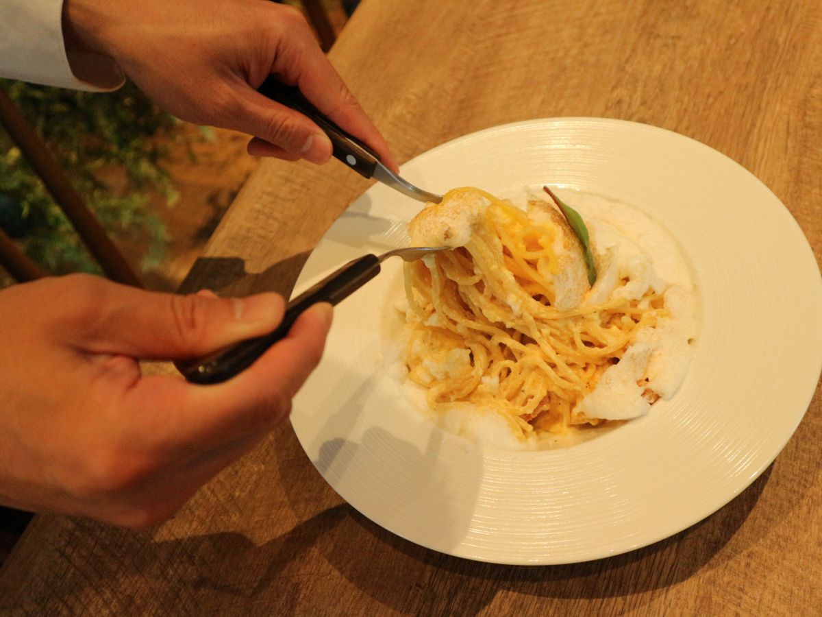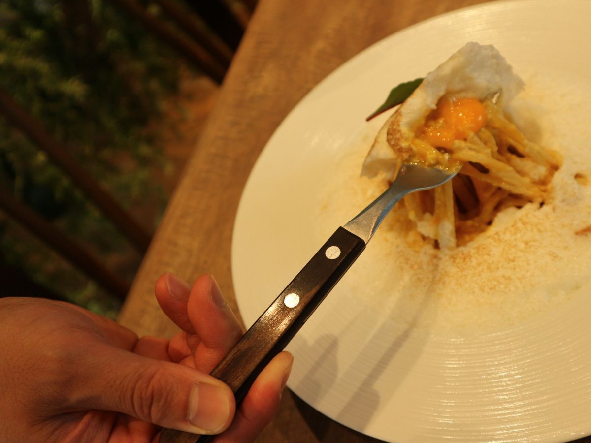 メレンゲの下には、中央に卵黄が隠れていました。そして、生クリームやチーズなどの自家製カルボナーラソースが絡んだパスタが登場!
