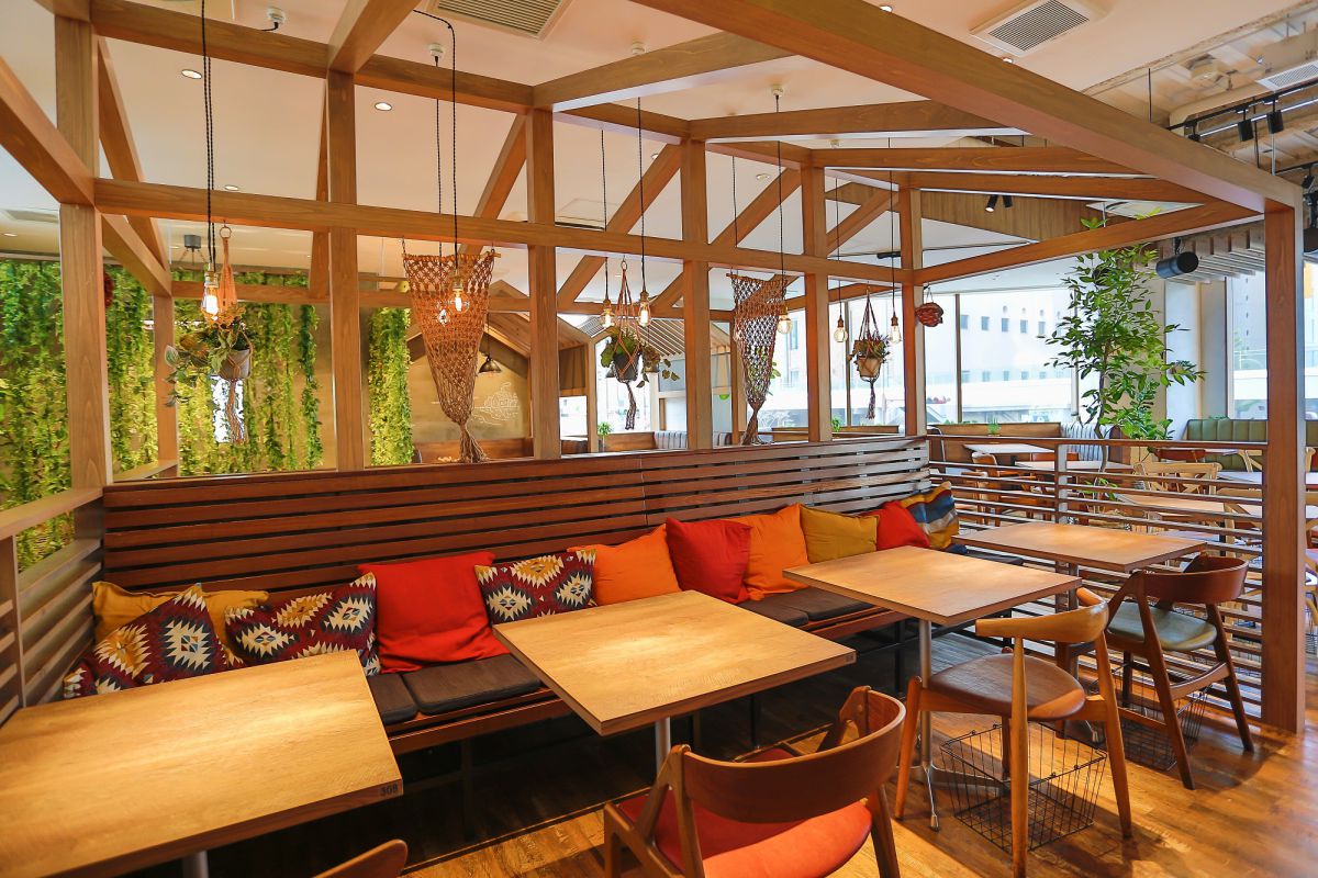 ”リスがいるような森”をイメージした店内は、大きなガラス窓から入る光が明るく、ウッディでグリーンを基調とした、ナチュラルな雰囲気。
