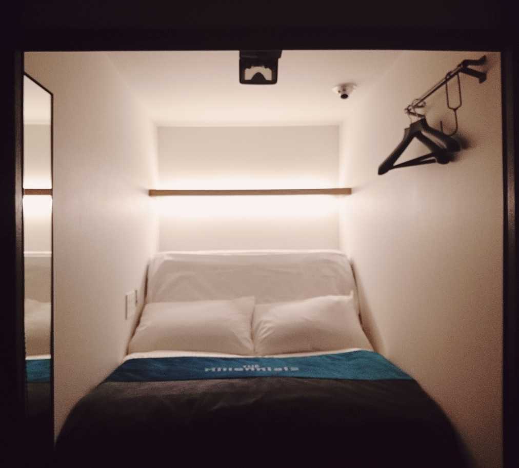 ノマドワーカーの強い味方「ザ・ミレニアルズ」ですが、れっきとした宿泊施設。1つ1つの部屋は「スマートポッド」とよばれ、天井高2.3mの空間に、横幅120cmのセミダブルサイズのリクライニングベッドが設置されています。