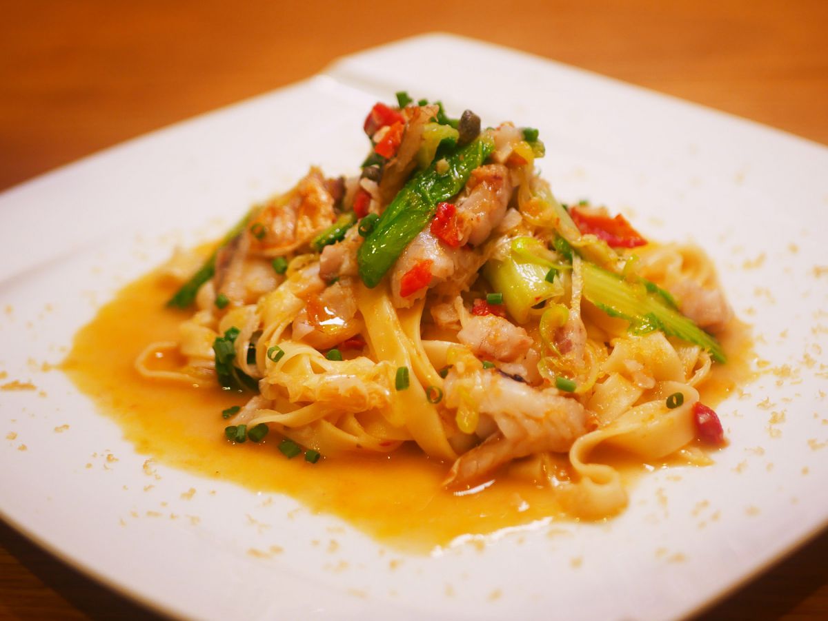 「甘鯛としろなのパスタ(ランチセットで2000円)」は、自家製のもちもち平打ち麺と、その食感に負けない濃厚ソースのマッチングが最高。