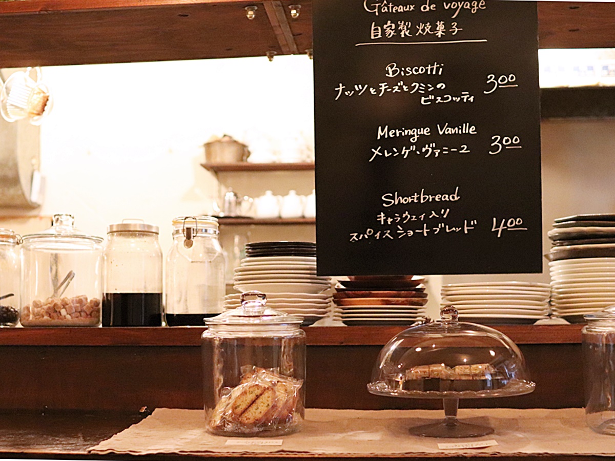 カウンターに並ぶ焼き菓子やワインのボトルがワクワクした気持ちを高めてくれます。