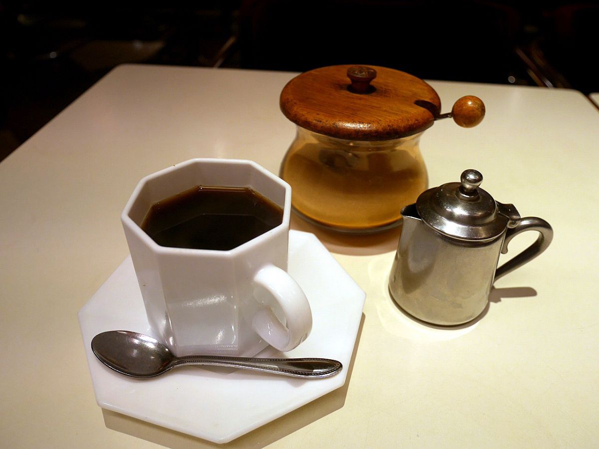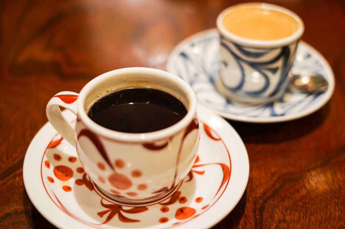 「純喫茶マウンテン」の魅力は、ボリューム感のあるスイーツだけではありません。「アメリカンコーヒー(左手前)」と「ブレンドコーヒー(右奥)」は味わいのある器も魅力的。