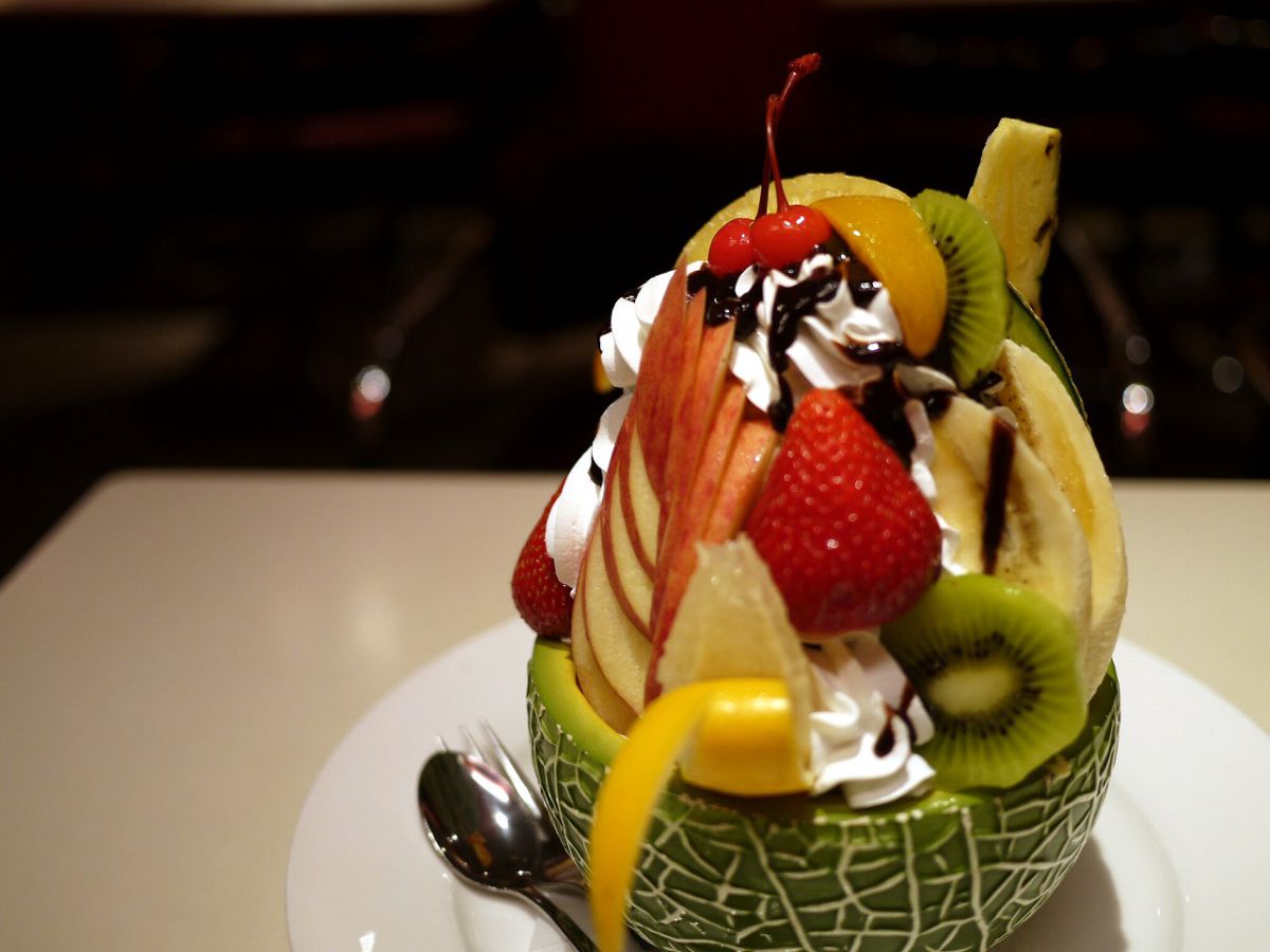 メロンの形をした器に、季節のフルーツがぎっしり詰まっていて、ほかでは見られない華やかさ。