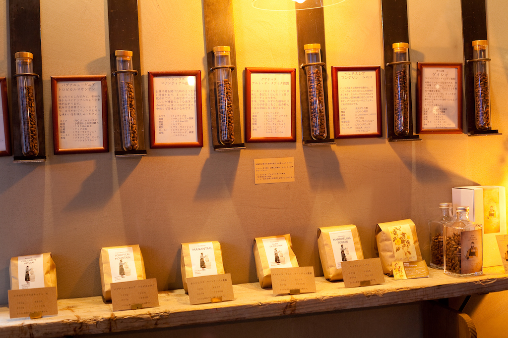 壁にはお店で飲める6種類のスペシャリティコーヒー豆が並んでいて、自由に見て、蓋をあけて、匂いをかぐことができます。注文するコーヒーを好きな香りで選べるのはうれしいポイント!