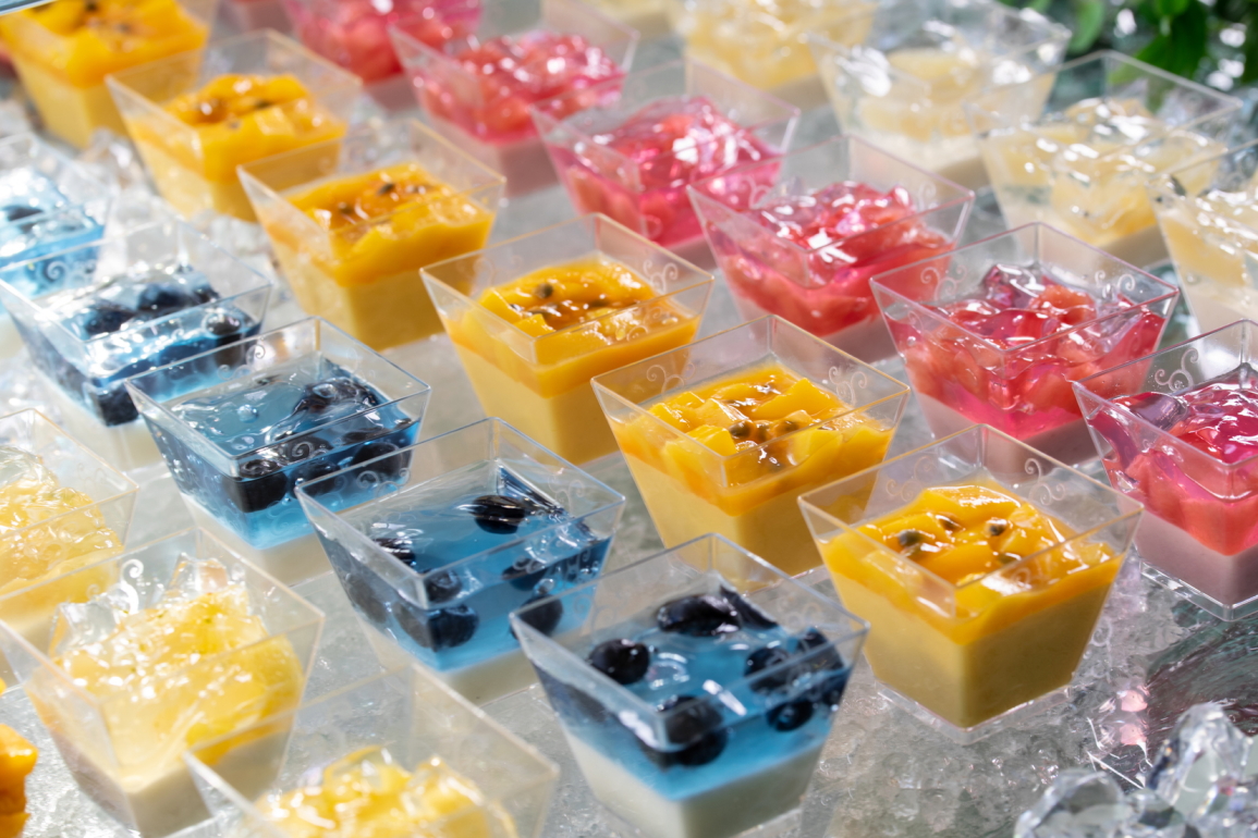 見逃せないのはカラフルなグラスデザート。マンゴープリン、パイナップルココナッツなど5種類が並んでいて、見た目も可愛らしく、思わず写真に撮ってしまいたくなるほど。