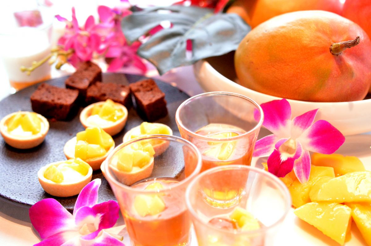 ふわふわのスポンジ生地とフレッシュマンゴーのトライフルや、ふるふる食感のマンゴープリン、マンゴーゼリーにドライマンゴーのパウンドケーキなどなど、旬のマンゴーを様々に変身させたスイーツが目白押し。