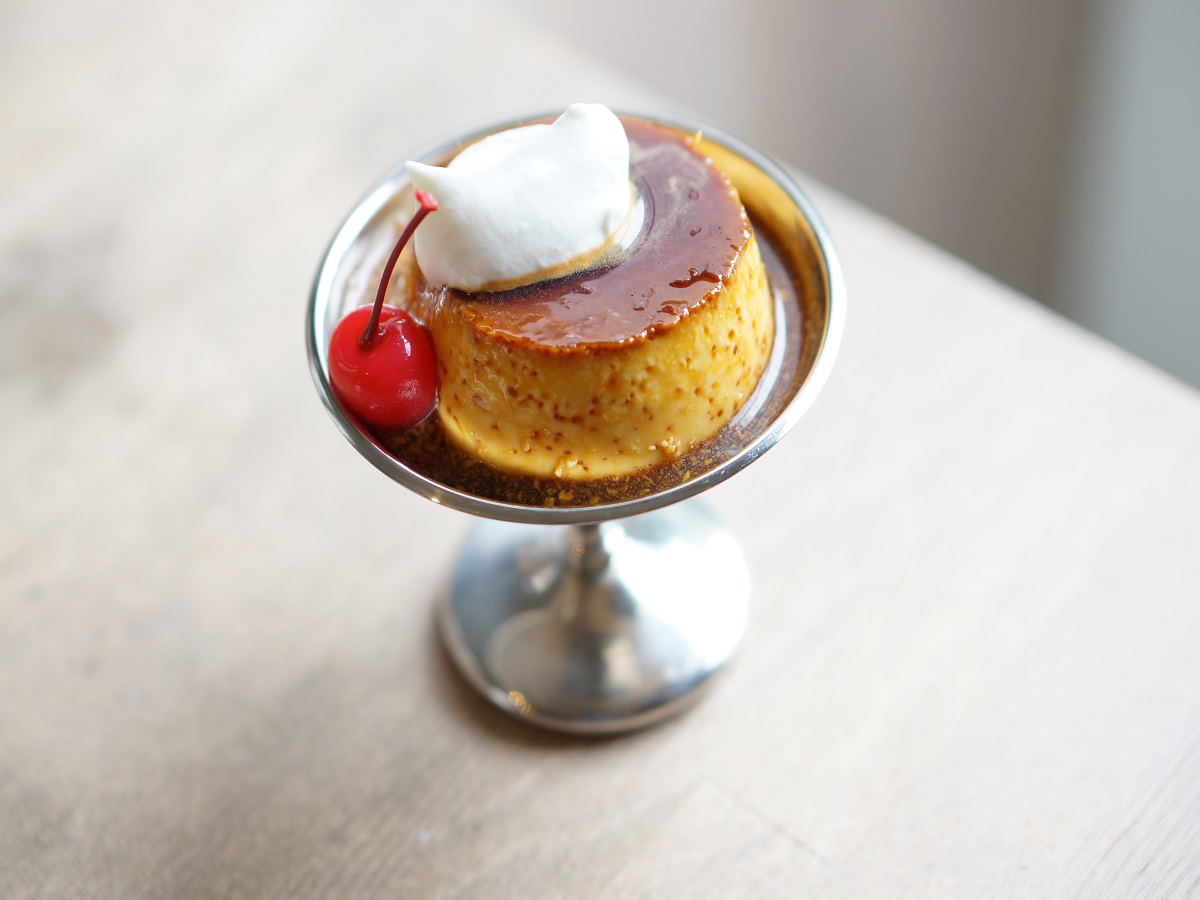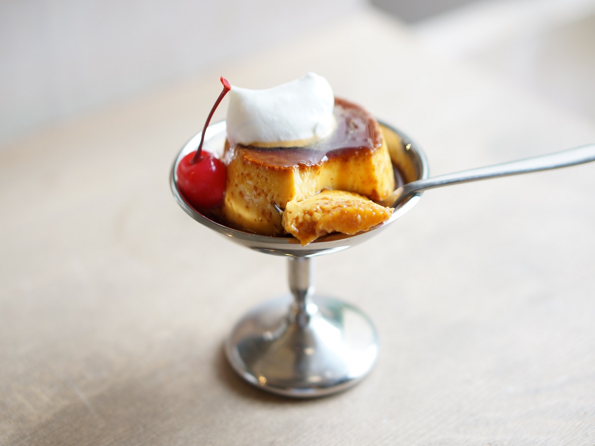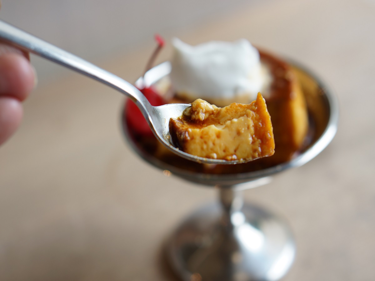 なつかしさを感じる銀製の食器に、あふれるカラメルソース。そして、ちょこんと乗せられたチェリー!卵は那須御養卵を使っているそうです。