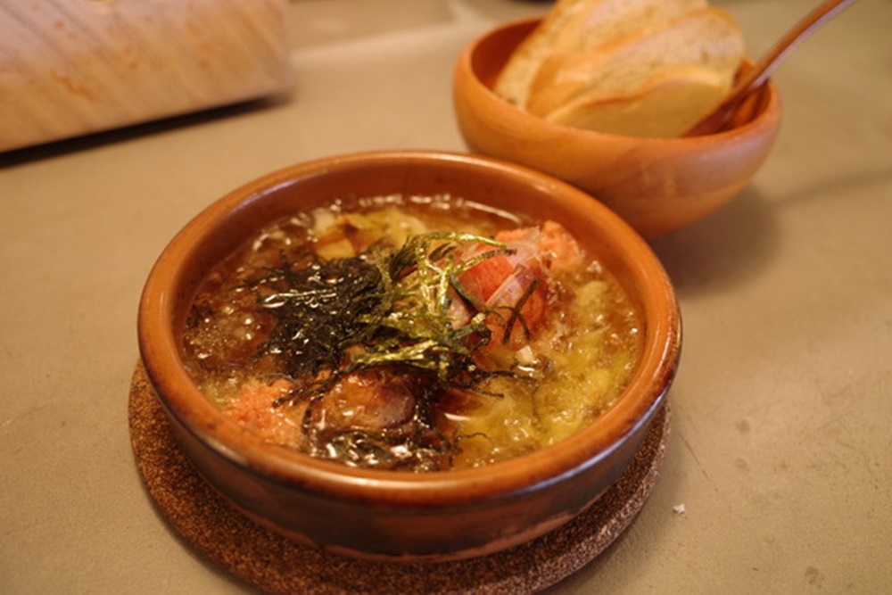 明太子のぷちぷち食感と山芋のシャキシャキ感が楽しい「山芋と明太子のアヒージョ」(780円)。添えてあるバケットをたっぷり浸して、いただきます。
