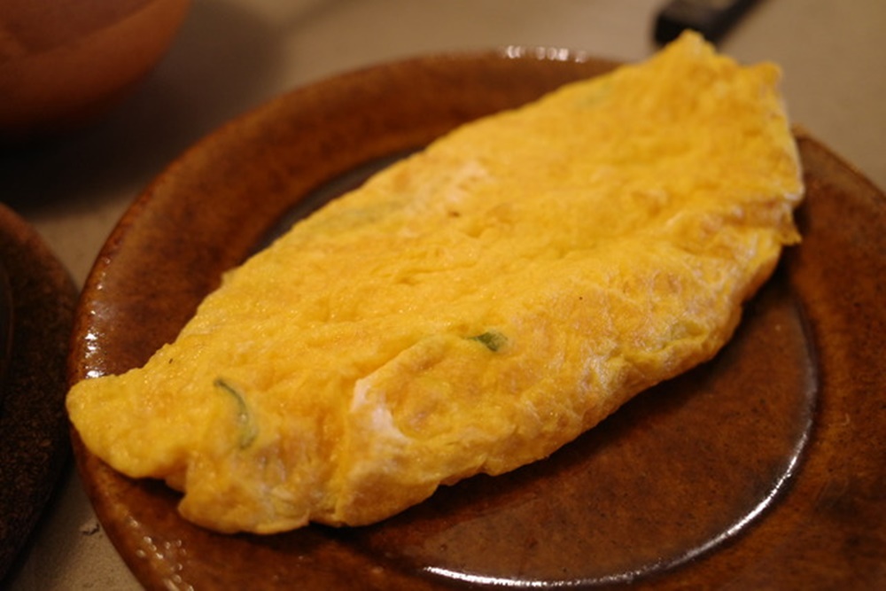ふんわり焼かれた「ニラ玉」(380円)は小さめのサイズ感。おひとりさまにもおすすめですよ!