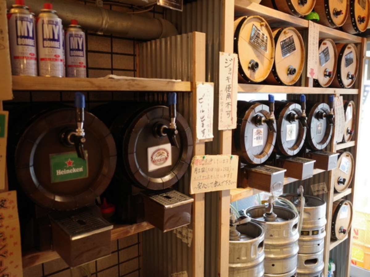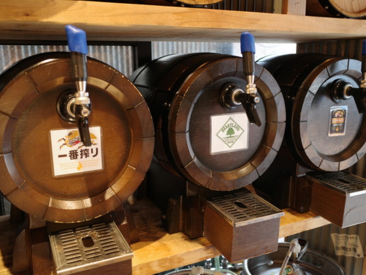 お店に入り、さっそく飲み放題をオーダー。グラスを渡してもらえるので入口付近にある樽から好きなものをチョイスして注ぎましょう。