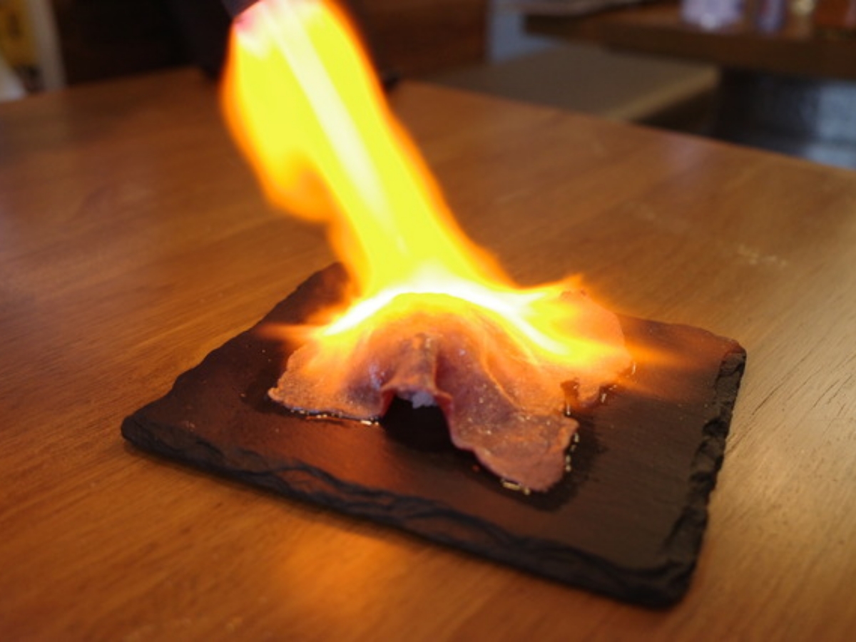 お酒の準備ができたら、お通しの登場です。こちらは「霜降り和牛の炙り寿司」。目の前で店員さんが炙ってくるパフォーマンスも。