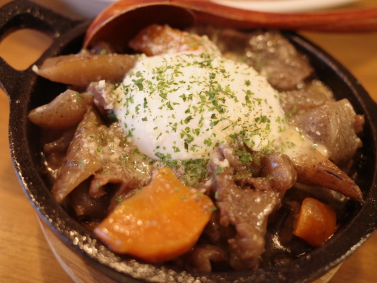 とろっとろに煮込まれた「黒毛和牛すじ煮込み」(680円)。温泉卵を崩してたっぷり絡めていただきましょう。