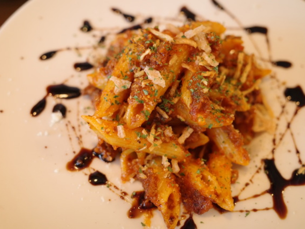 お肉屋さんだからこそできる、黒毛和牛を使った〆パスタ「黒毛和牛のペンネボロネーゼ(1180円)」。