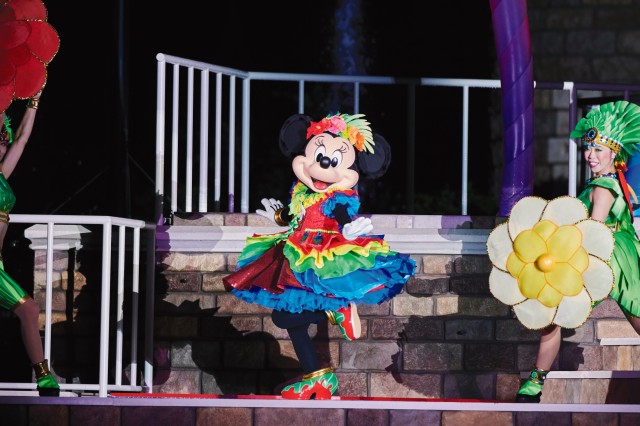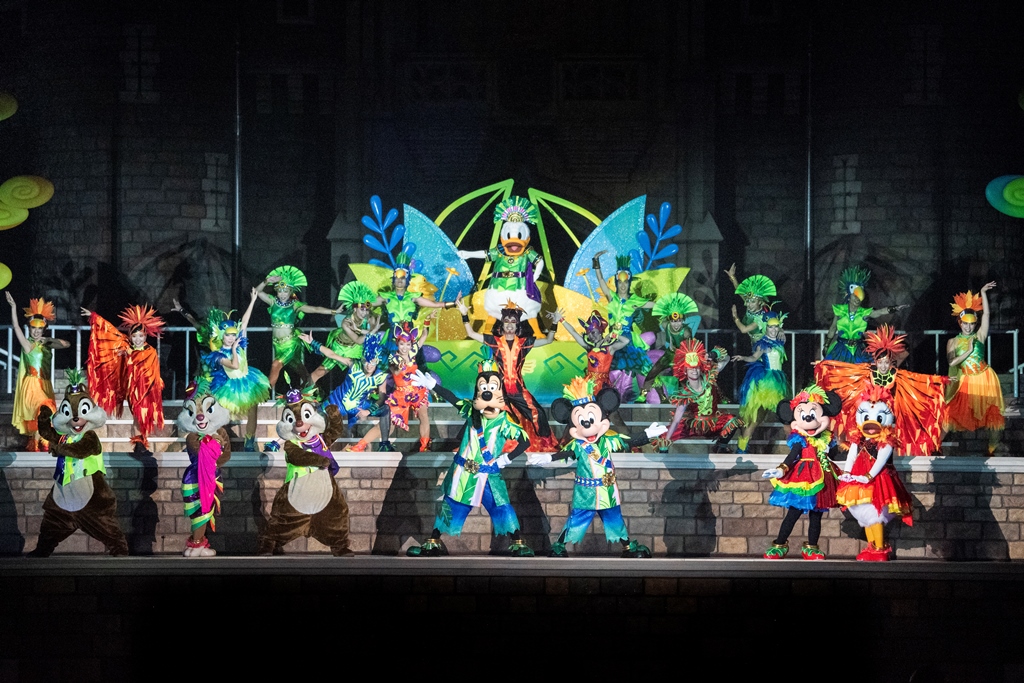 夏の夜に映える、キャラクターやダンサーたちの衣装も注目ポイント。ジャングルの舞台にぴったりなカラフルさと動物モチーフのコスチューム。