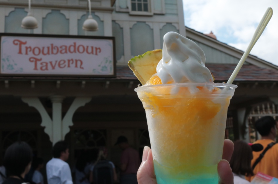 ドナルドをイメージしたシェイブアイス550円。甘く爽やかな風味のシェイブアイスにソフトクリームとパイナップルをトッピング。下にはゼリーも入っていてボリューミー。「トルバドールタバン」で販売中。