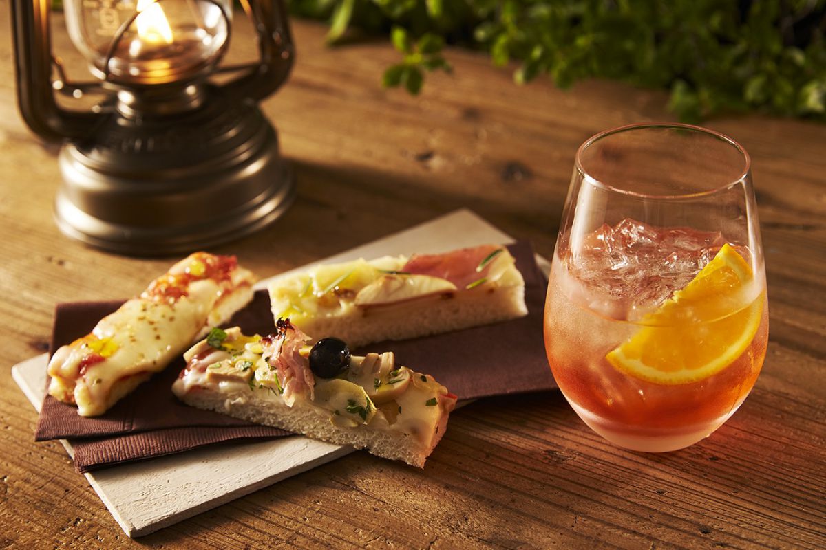 さらに、オレンジ風味の甘くてほろ苦いリキュール「アペロール」を使用した爽やかなカクテル“アペロール スプリッツ”に、スティックタイプの“フォカッチャ ピッツァ”を合わせた「アペリティーボ」は、夕方から楽しむイタリアならではのメニューです。