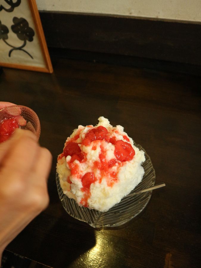 氷が崩落しないようにそぉっと、かつ手早くシロップをかけます。この段階からいちごの香りがふわりと漂い、早く食べたい衝動が沸き上がってきます。 練乳を含んだ氷にとろっといちごシロップが絡み、「これは絶対美味しいだろう」という期待値がぐんぐん上昇。