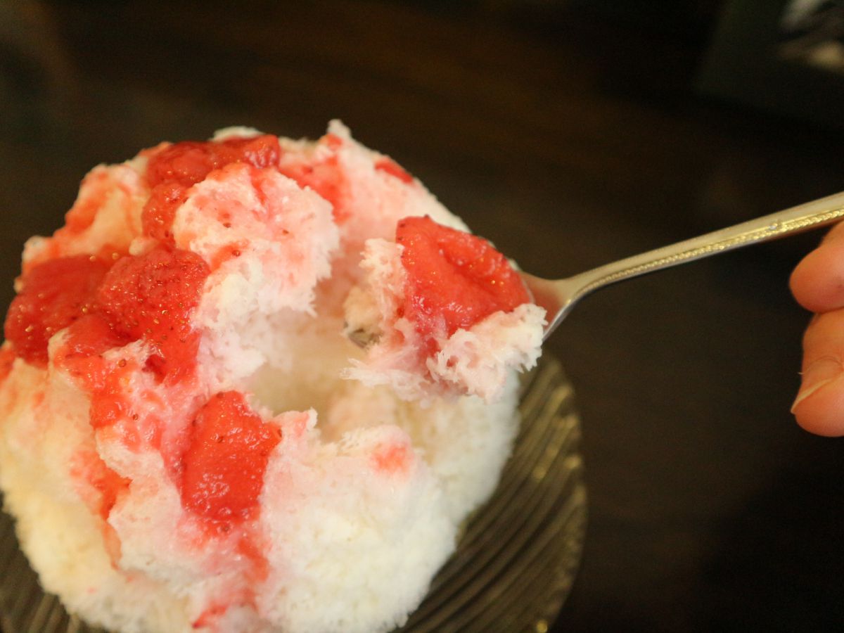 しゅわっさくっと軽い食感の氷になじむ甘酸っぱいいちごシロップは、果肉感がすごい!いちご本来の甘みは、ミルク氷と合わせたときの相性が抜群です。このかき氷を求め、連日長蛇の列も納得のおいしいさです。