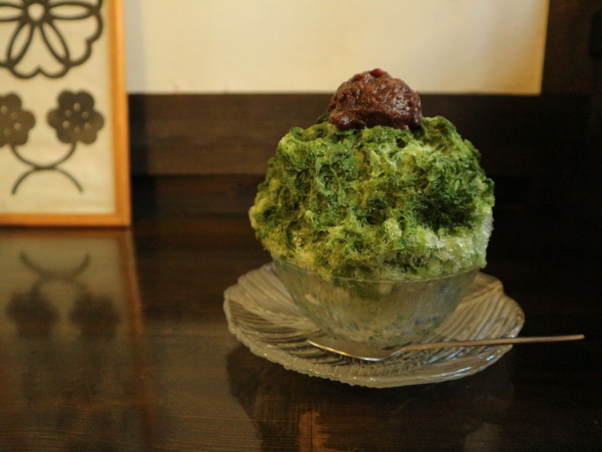 いちご系かき氷と人気を分かつのが、自家製の抹茶シロップがたっぷりかかった、宇治ミルク金時(700円)。 氷になじむよう、かき氷用に炊いた餡は、しっとり滑らかな舌触りの粒餡。ほろ苦い抹茶シロップと甘い練乳に、上品なアクセントを添えてくれます。また、冷た~い口のなかをちょっと休憩させてくれる、欠かせない存在の餡なのです。