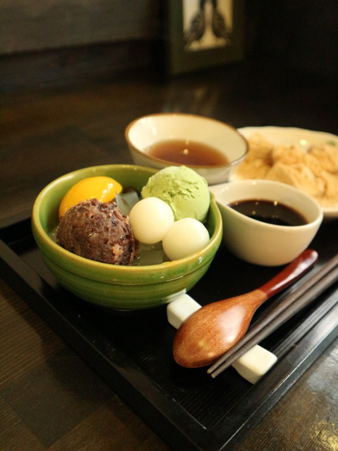 あかちゃ家といえば、自家製寒天を使ったあんみつが有名です。こちらは、あんみつに次ぐ人気者、わらびもちも一緒にいただける贅沢なセット「あんみつ&わらびもち」650円(抹茶アイスクリーム付き)。