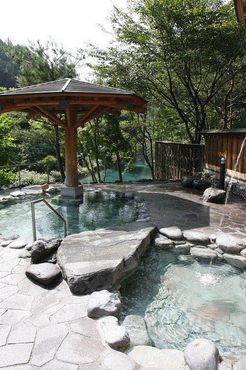 「中之条ビエンナーレ」でアート鑑賞を満喫したあと、あるいはアートめぐりをしながら、中之条町の温泉地や名所に立ち寄ってみるのもオススメです。中之条町は、山々と清流が織りなす美しい里山と養蚕農家の面影が残る温泉郷。会場のひとつ、中之条町伊勢町から車で北へ25分ほど走ると歴史ある湯宿や日帰り温泉施設も多い四万温泉があります。