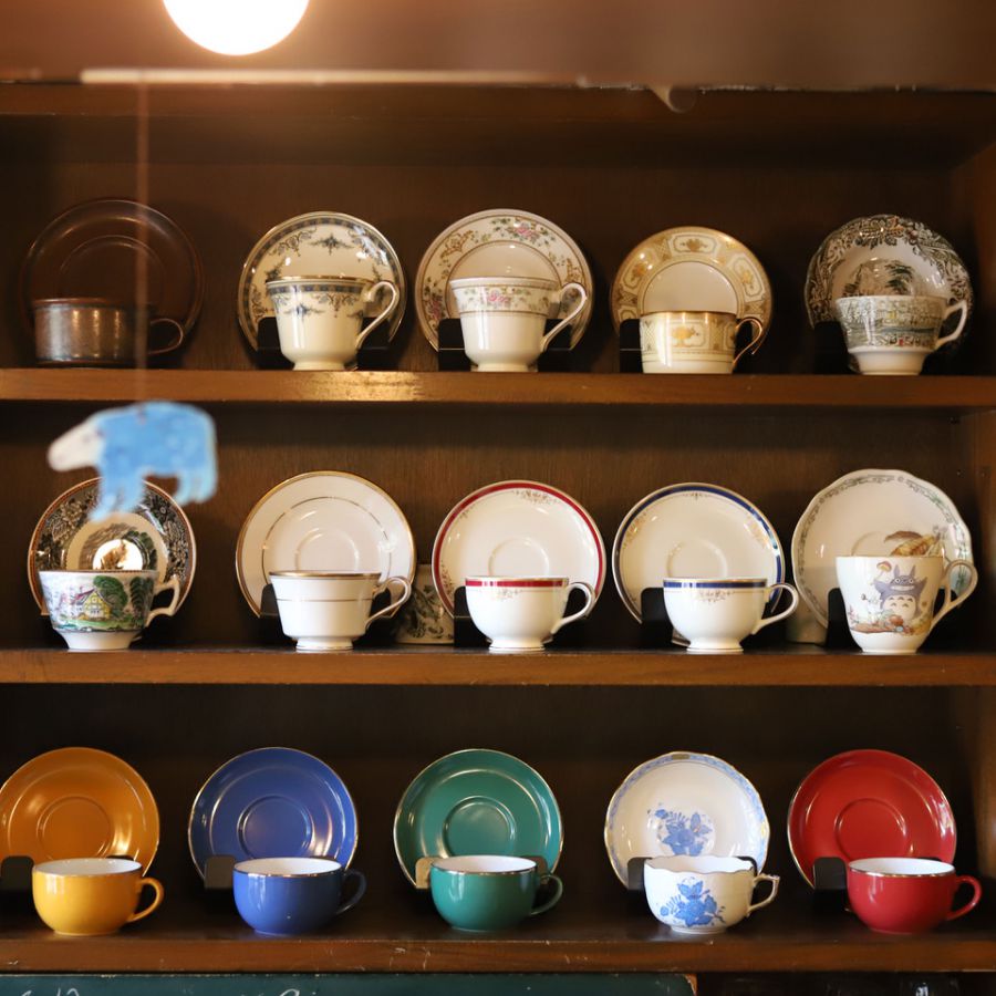 珈琲を淹れるカップは、棚に並んだものからお好みで選択可能。