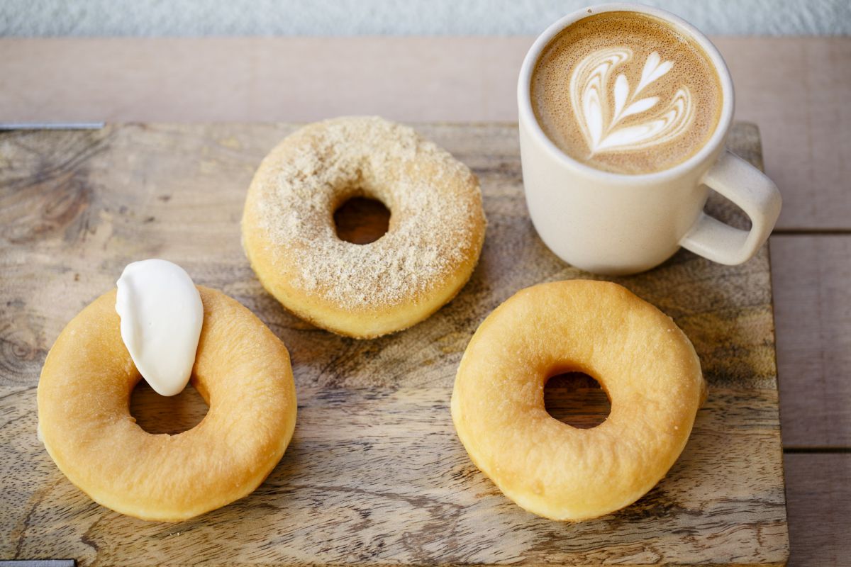 この店のドーナツは保存料や添加物を使わず、トランス脂肪酸フリーのパーム油100%の油で揚げています。ヘルシーなドーナツは今年注目です!(写真左から)ハニーマスカルポーネ300円、黒豆塩きな粉260円、プレーン220円、ラテ500円。ハンドメイドで作るドーナツとすっきりとした味わいのラテが好相性です。
