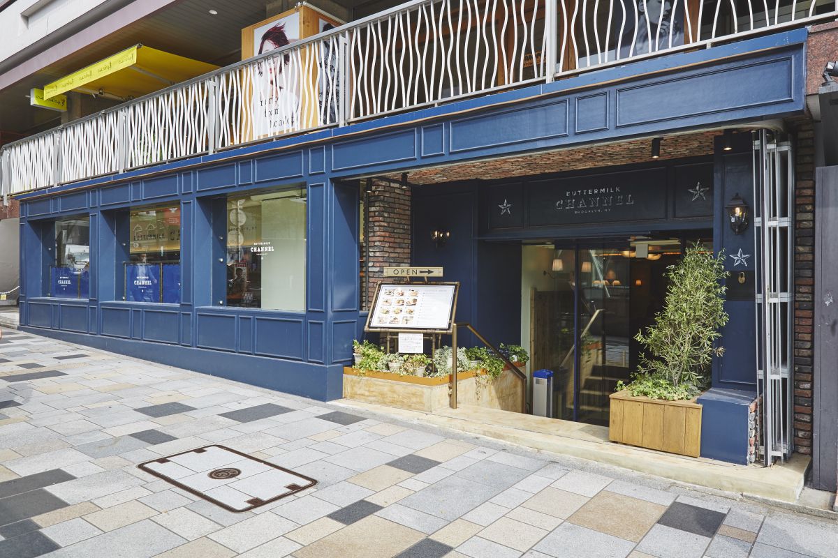 バターミルクを使用して作る、やわらかくてジューシーなフライドチキンや、ふわふわのパンケーキなど、アメリカの定番料理が揃うお店。スイーツやお酒も豊富です。地下鉄の出口すぐにある青い外観が目印!