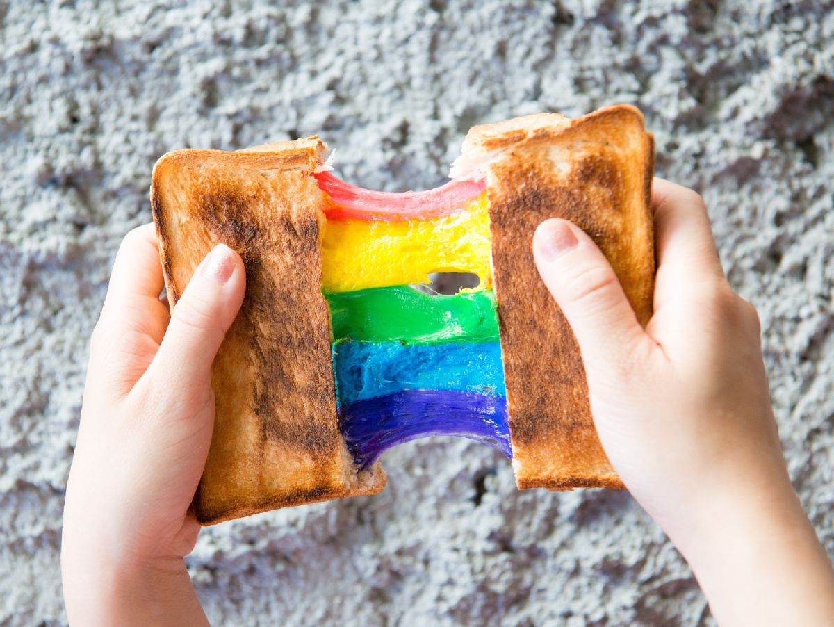 この店の看板メニュー、レインボーサンド1080円。厳選した200gのモッツァレラチーズに魔法をかけて虹色に!