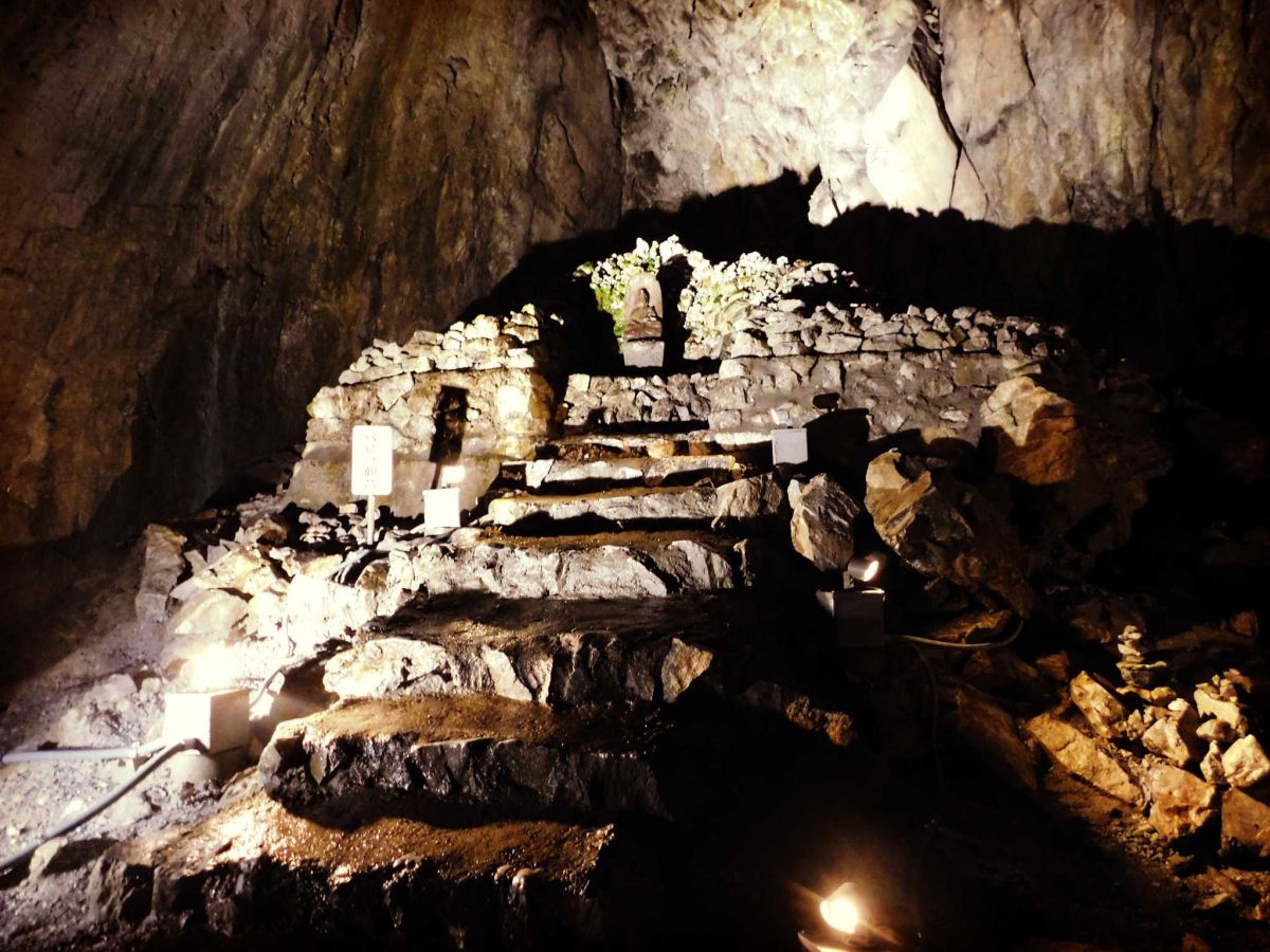 「死出の山」の階段を上っていくと、そこには石積みに囲まれた「縁結び観音」が。良縁を求めて、鍾乳洞を訪れる人も少なくないのだとか。 階段を上り下りするときは足元が濡れているので気をつけて!ライトアップに見とれて転んでしまわないように。
