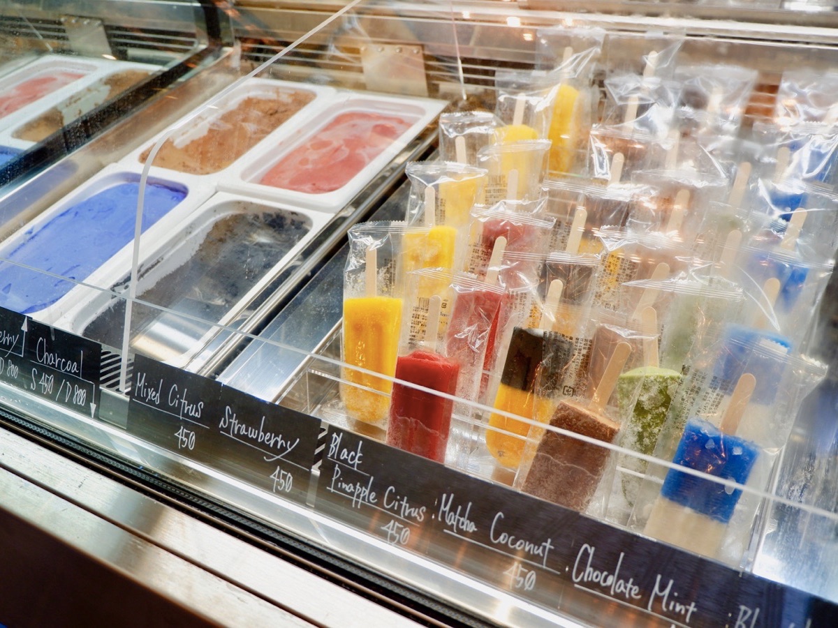 ショーケースにはカラフルでポップな4種類のジェラート(ショート税込450円、ダブル税込800円)や6種類のアイスキャンディー(各税込450円)がずらり。