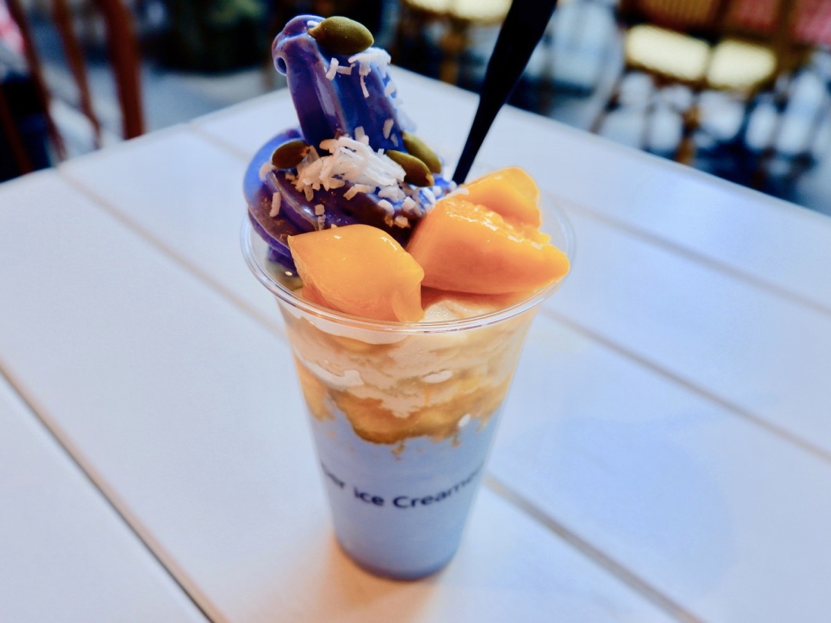今回は「ウルトラブルー&マンゴー」をいただきました!なめらかなヴィーガン生ソフトクリームと、みずみずしいマンゴーの組み合わせがたまりません。