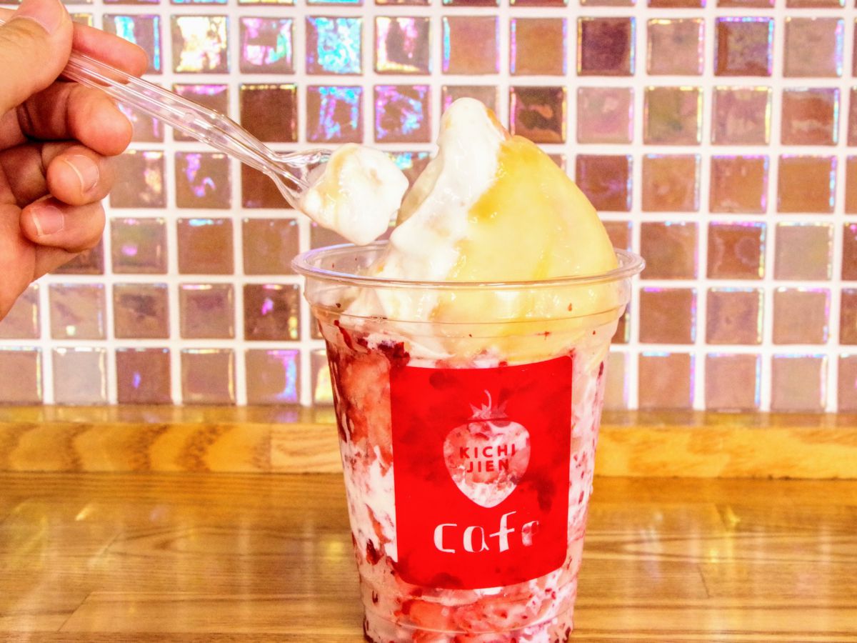 KICHIJIEN Cafeで人気の「赤くま」(880円)とは、凍らせた完熟いちごをかき氷のように削ったシャーベット状のいちごと、ジャージー牛乳で作られたソフトクリーム、季節のフルーツを組み合わせた冷たいパフェのことです。