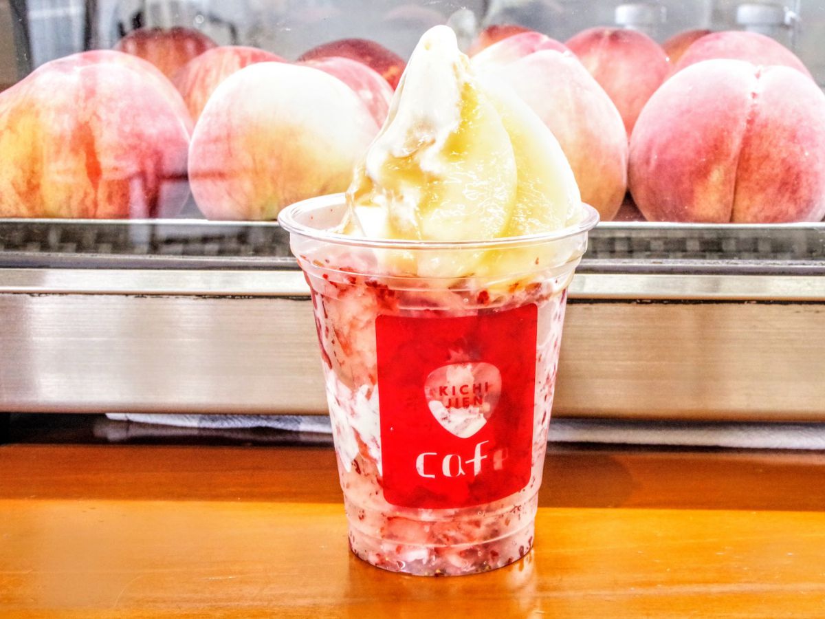 「吉次園の果物を、一番おいしい食べ方で多くの人に食べてもらいたい」というオーナーの思いと、果樹園のこだわりが詰まった赤くま。トッピングされるフルーツは、6月から7月までは桃、8月から10月まではぶどうです。そのとき一番おいしい果物がトッピングされた、旬の赤くまを味わいましょう。