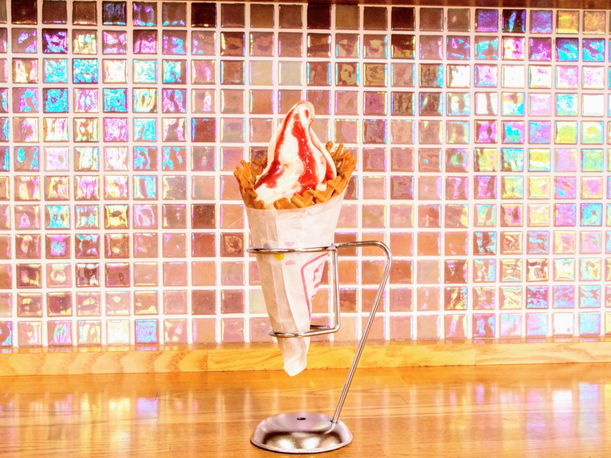 ジャージー牛乳を使ったソフトクリームが、コーンの下の方までぎっしりと詰まっています。KICHIJIEN Cafeのソフトクリームはコーンにもこだわりがあり、スタッフが店内でひとつずつ手焼きしています。ザクザクした食感のコーンは甘いクッキーのような味わいで、食べ応え抜群。常連客の中には、この手作りコーンのみを注文する通なファンもいるそうです。