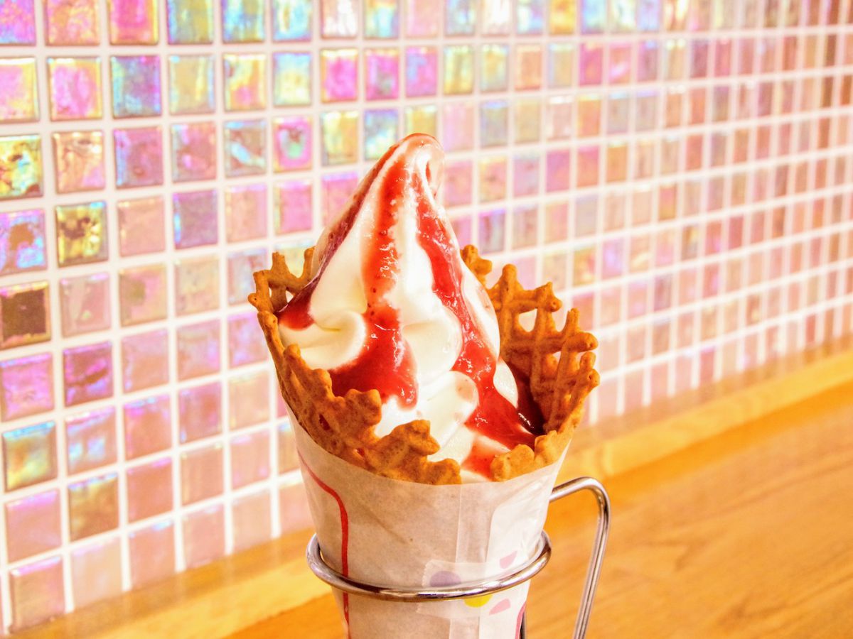 一年を通して販売されるソフトクリームも、ぜひ食べておきたいスイーツです。こちらは自家製のいちごソースがトッピングされた「いちごソフト」(380円)。阿蘇の牧場から直送されるソフトクリームは、コクがあるのに後味さっぱり。ソフトクリームを求めて通い詰めるリピーターも多いそうです。