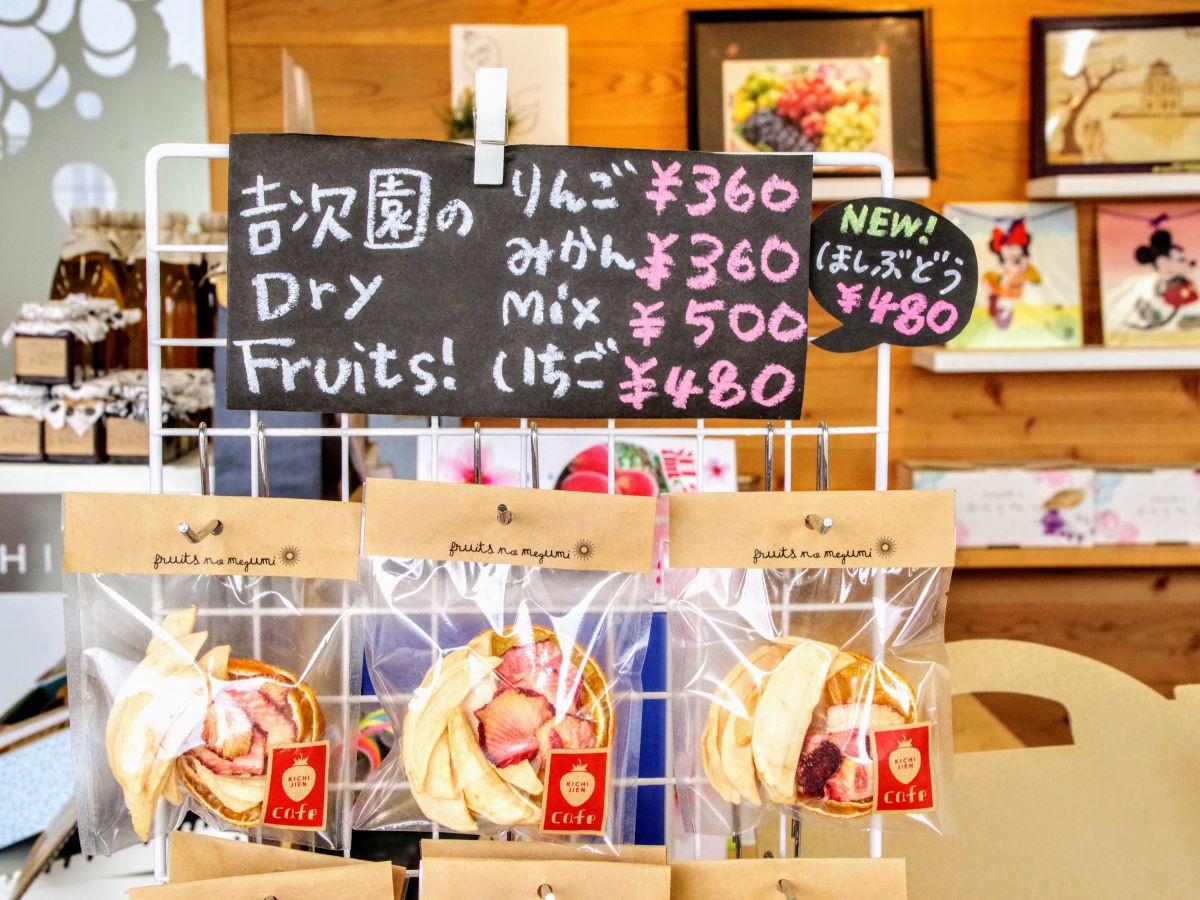 カフェの隣には吉次園で採れた果物や、フルーツを使ったオリジナルの加工品が購入できる直売所があります。こちらはちょっとした手土産にも喜ばれそうな、手作りのドライフルーツ。