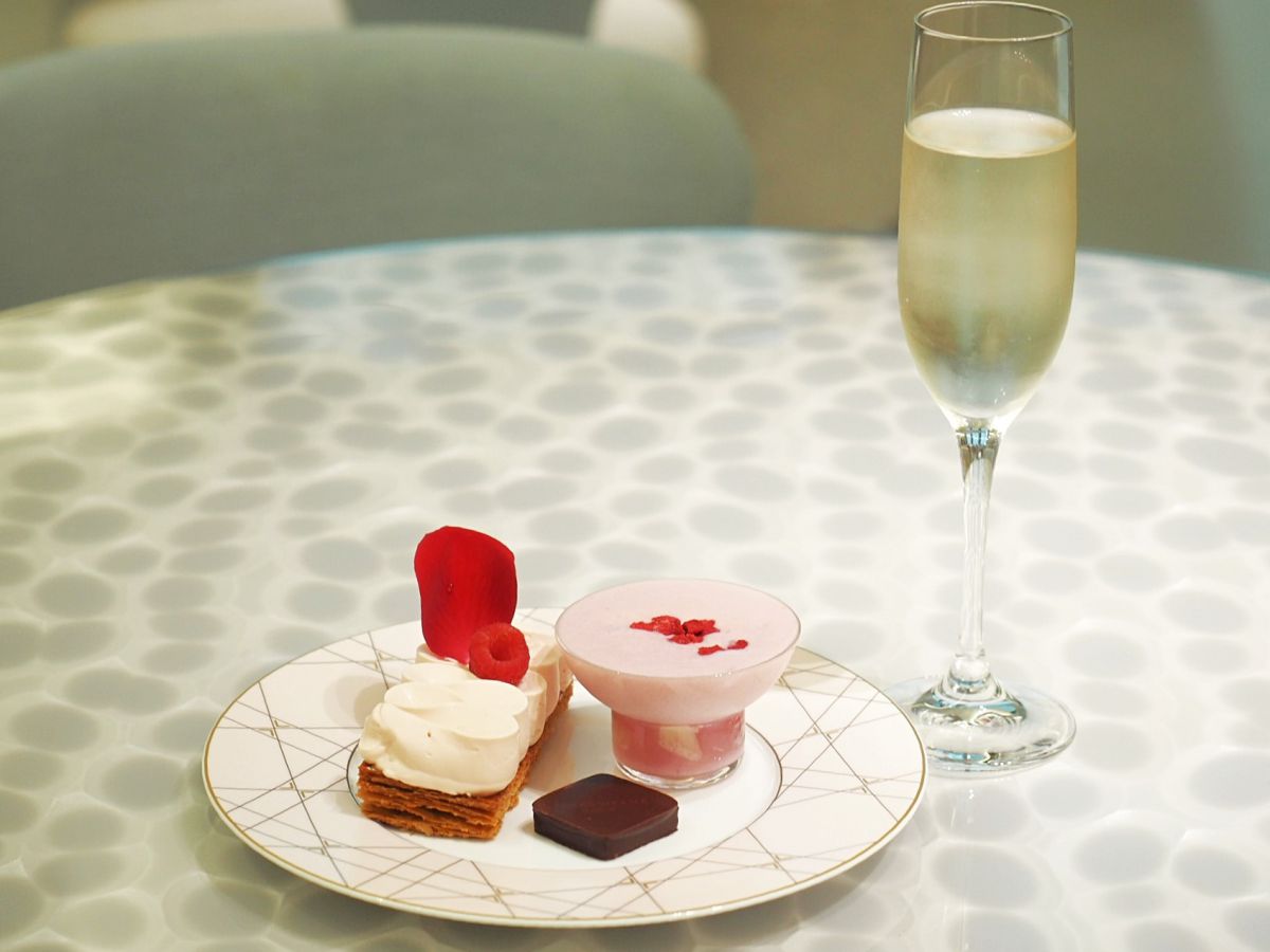 ピエール・エルメの哲学がぎゅっと詰まったスイーツは、芸術品のような見た目で、どれも繊細な味。ご褒美旅にはスイーツと一緒にシャンパンはいかが?写真のシャンパーニュとミルフィユ、ボンボンショコラがセットになったメニューは2900円(別途サービス料13%+消費税)。ブランチやアフタヌーンティー、お酒と一緒に楽しめるメニューも揃っています。
